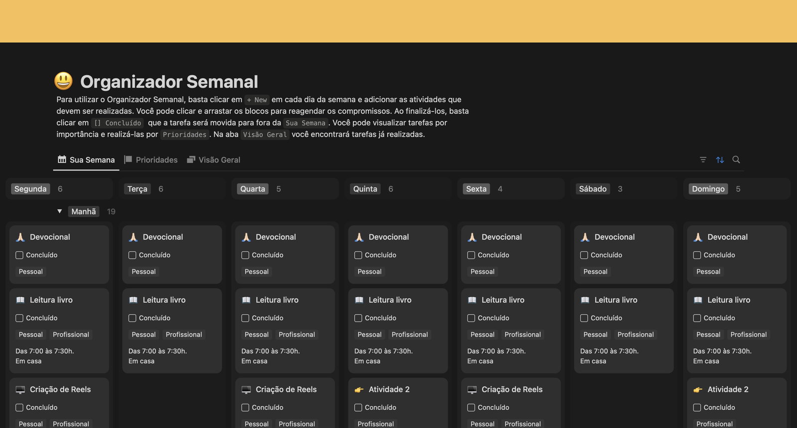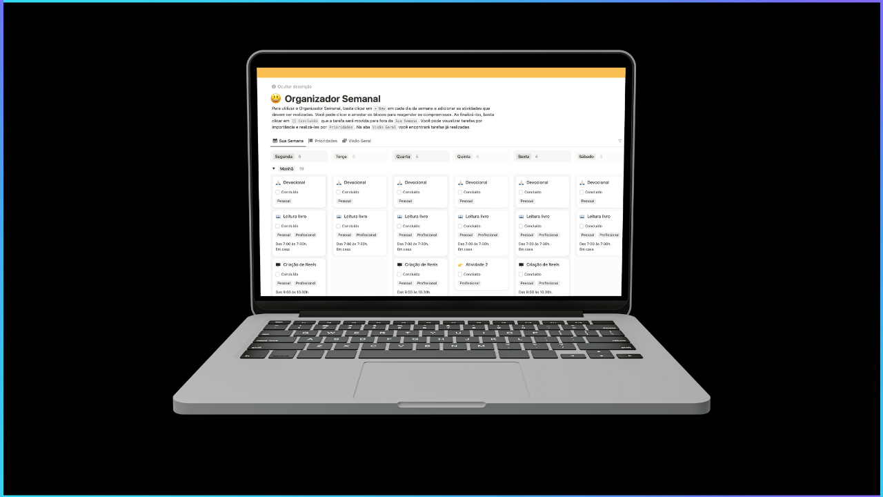 Ou seja, o Planejador Semanal é utilizado para organizar sua semana de forma simples e eficiente, sem que você precise perder tempo com métodos complicados.